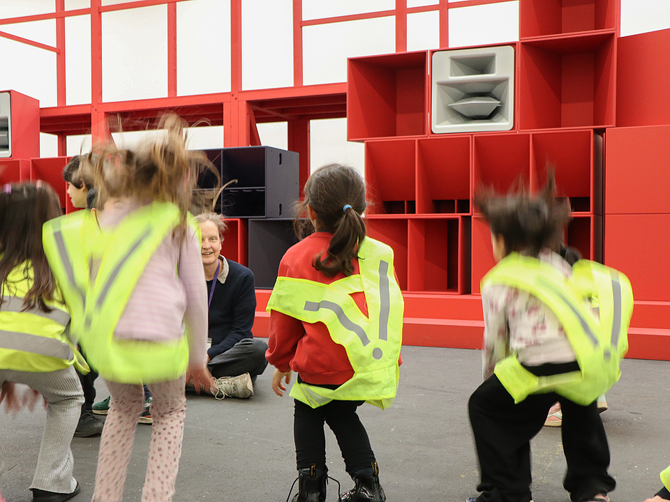 Ein Besuch beginnt oft im Atelier des Museums. Beim gemeinsamen Frühstück wird ausprobiert und diskutiert: Welche Geräusche können wir erzeugen? Wie fühlt sich ein Raum an? Was fällt uns an einem Kunstwerk zuerst auf? „Das klingt wie Regen!“, ruft ein Kind und plötzlich wird aus dem Tisch ein Instrument. In den Ausstellungen selbst werden Kunstwerke nicht nur betrachtet, sondern mit allen Sinnen erschlossen: Wie klingt die Farbe Silber? Welche Geräusche passen zu einer Skulptur? Vor einer Arbeit des türkischen Künstlers Cevdet Erek hören die Kinder aufmerksam hin. Die rhythmischen Schienengeräusche der Installation greifen sie unmittelbar auf: Sie bilden einen Zug, bewegen sich gemeinsam durch den Raum und folgen den Klängen. „Das ist wie eine Eisenbahn!“, ruft ein Kind.