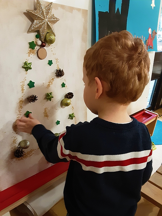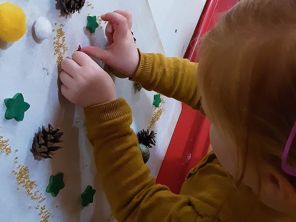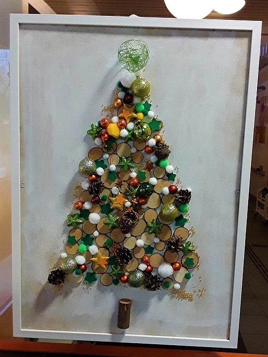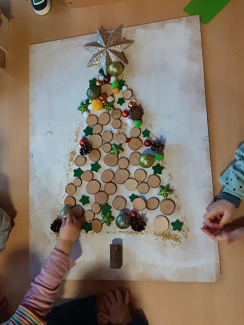 Die Kinder im U3 Bereich vom FRÖBEL-Kindergarten & Familienzentrum An St. Matthias haben aus alten Materialien ein neues Weihnachtskunstwerk geschaffen.