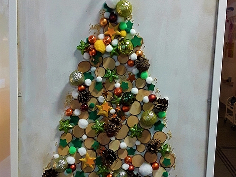Damit die Dekoration im Keller nicht noch länger verstaubt, wollten die Kinder die Materialien verwenden, um damit etwas Neues zu schaffen. Ein paar kleine Kugeln, Glitzersterne, Stoffbällchen und selbstgemachte Sterne aus Salzteig, kombiniert mit Holzscheiben und Kiefernzapfen wurden von den Kindern nach Belieben angeordnet. So entstand ein wundervoll leuchtener Weihnachtsbaum! Ganz ohne neue Materialien.