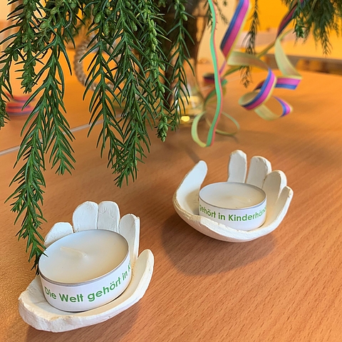 Die Welt gehört in Kinderhände! Im FRÖBEL-Kindergarten Augustastrolche haben die Kinder besondere und individuelle Teelichthalter aus Ton gefertigt.