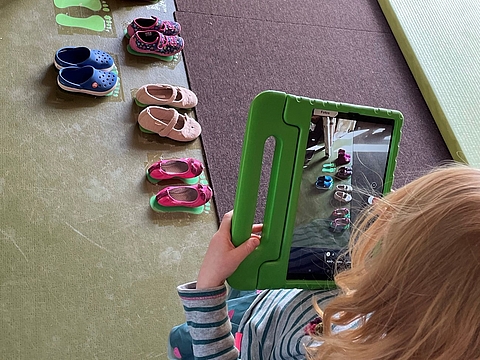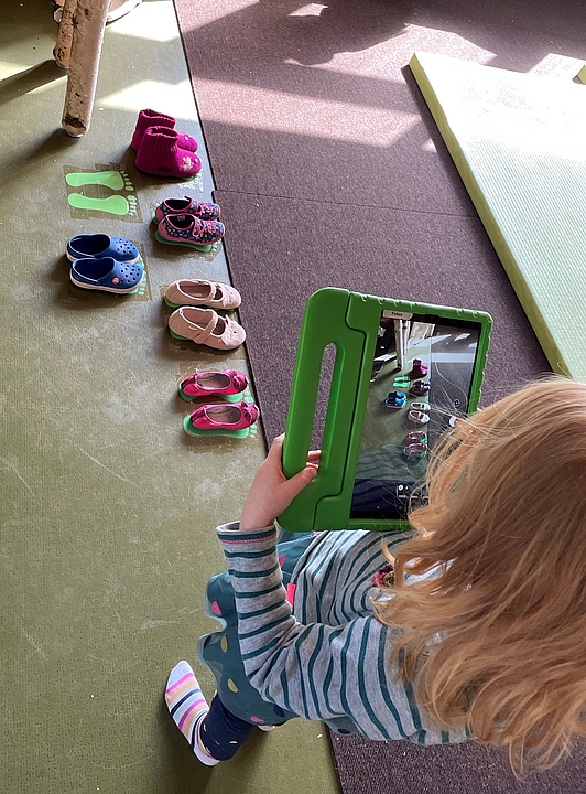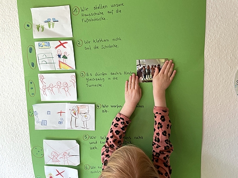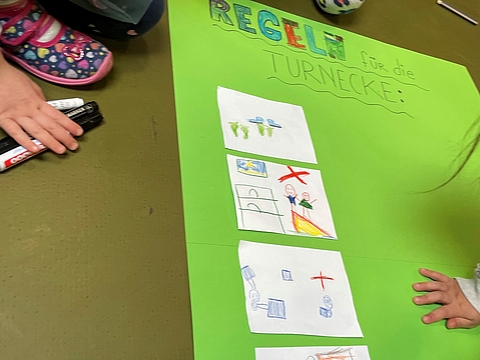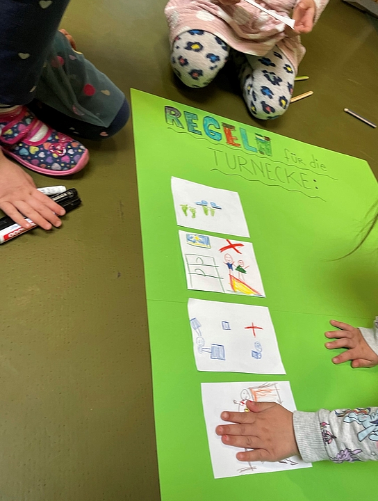 Die Kinder durften haben mitgewirkt: Da es hier auch mal etwas wilder zugeht, haben die Erziehenden und Kinder gemeinsam ein Regelplakat gestaltet, bei dem die Kinder ihre Regeln auf kleinen Piktogrammen gezeichnet, im Anschluss nachgestellt und selbstständig mit dem Tablet fotografiert haben. Daraufhin wurde das Ganze noch einmal im Morgenkreis thematisiert. Nun können die Fachkräfte sicherstellen, dass auch alle das Regelplakat nachvollziehen können. Durch die Fußabdrücke auf dem Boden, die die Anzahl der Kinder in der Turnecke symbolisieren, bekommen die Kinder die Möglichkeit, sich selbstständig abzuwechseln und können so lernen, Verantwortung zu übernehmen. Ein Projekt voller Partizipation und Mitbestimmung für die Gemeinschaft!