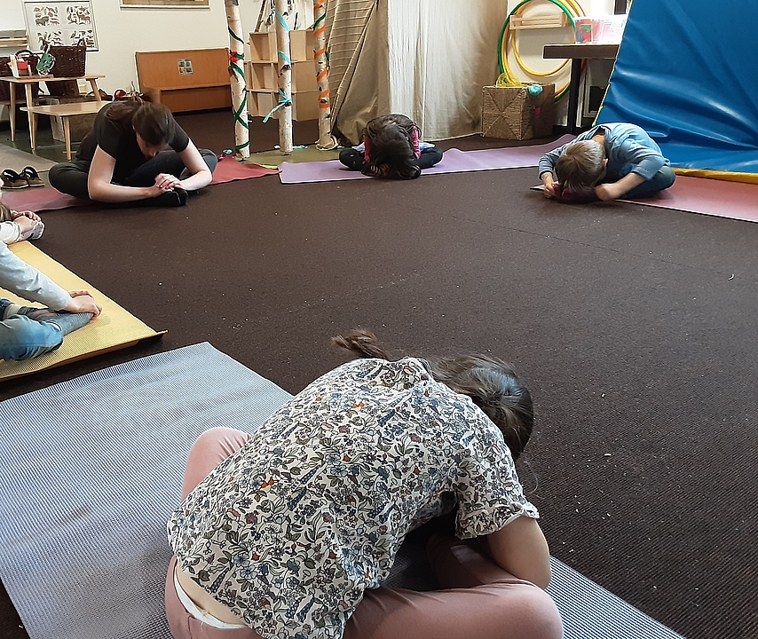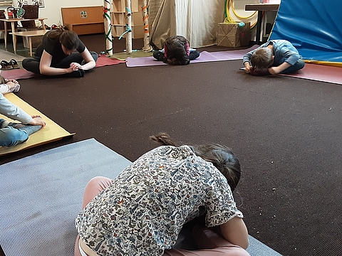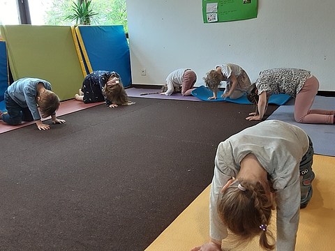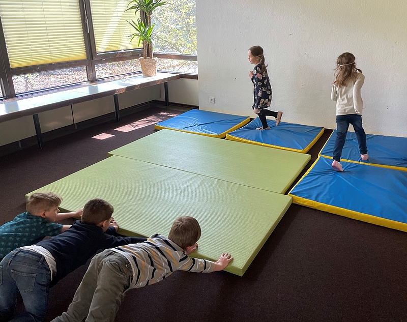 Darum haben die pädagogischen Fachkräfte nun gemeinsam mit den Kindern eine zusätzliche Bewegungsecke („Turnecke“) in einem Teil unseres großen Bauraums geschaffen. Bausteine raus - Matten rein! Hier können sich die Kinder sowohl im Freispiel, als auch bei regelmäßigen Bewegungsangeboten, wie Yoga oder Ringen und Raufen ausprobieren.
