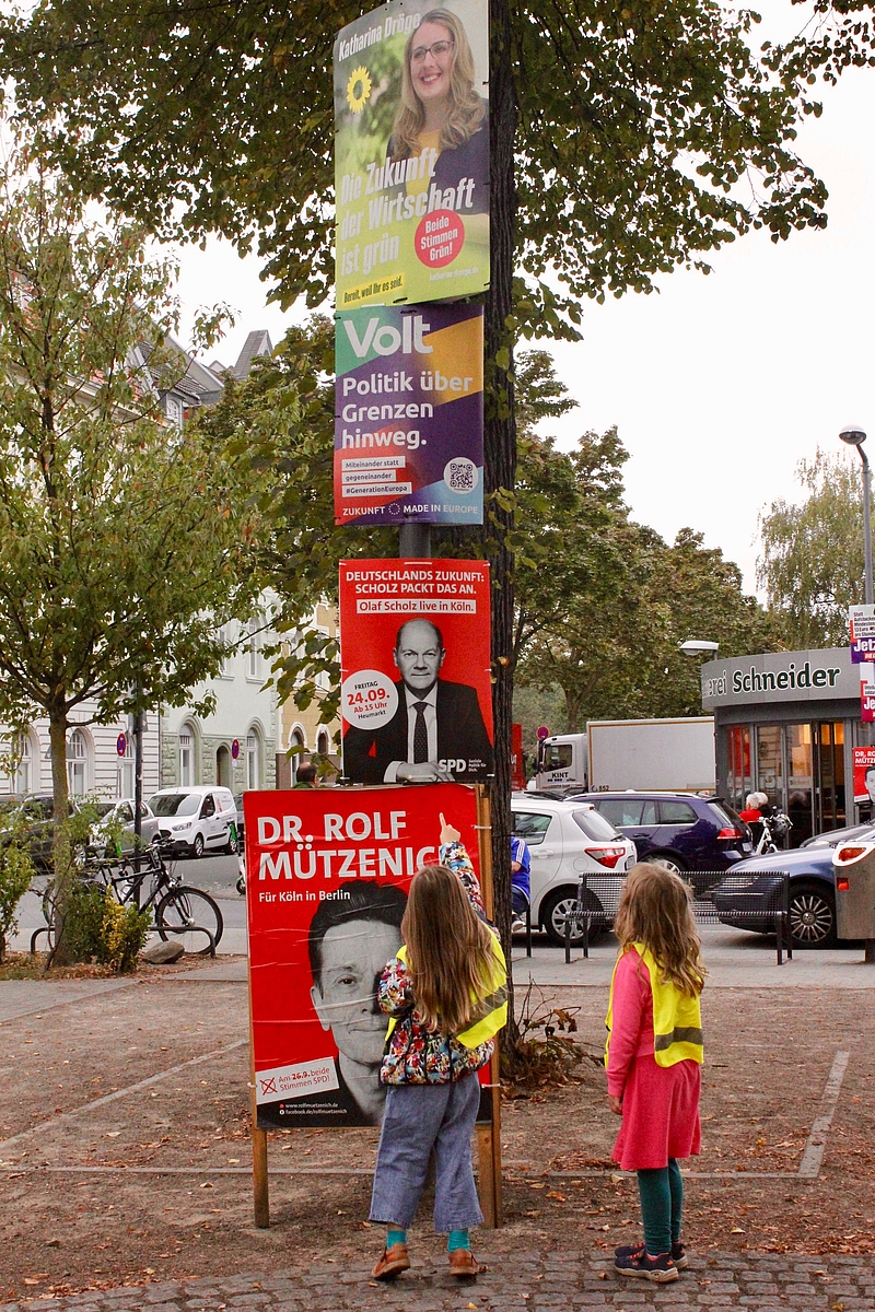 Angeregt durch die Bundestagswahl 2021 machen die Kinder und pädagogischen Fachlräfte des FRÖBEL-Kindergartens An St. Peter in Köln einen Spaziergang durch das Veedel und betrachten die Wahlplakate.