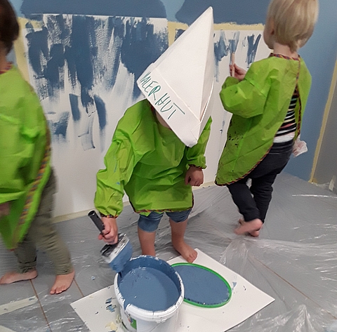 Die Kinder wählten die Motive und auch die Farben aus. Mit Zeitungspapier-Hüten und Kitteln machten wir uns gemeinsam an die Arbeit. Nach dem Streichen mussten alle baden, weil nicht nur die Wände gestrichen wurden.