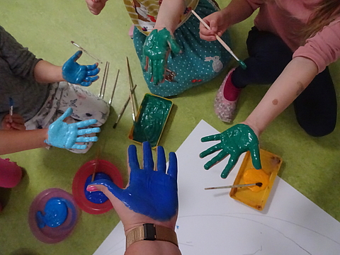 Mit Hand- und Fußabdrücken erschaffen die Kinder des FRÖBEL-Kindergartens An den Clouthwerken eine Weltkugel.