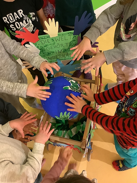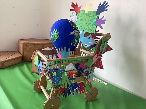 Das Jahresmotto 2020-2022 lautet „Unsere Welt in Kinderhände“ bot einige Assoziationen an und so kamen wir auf die Idee eine Weltkugel mit unseren Händen zu dekorieren und in einen unserer schönen Holzeinkaufswagen zu stellen.