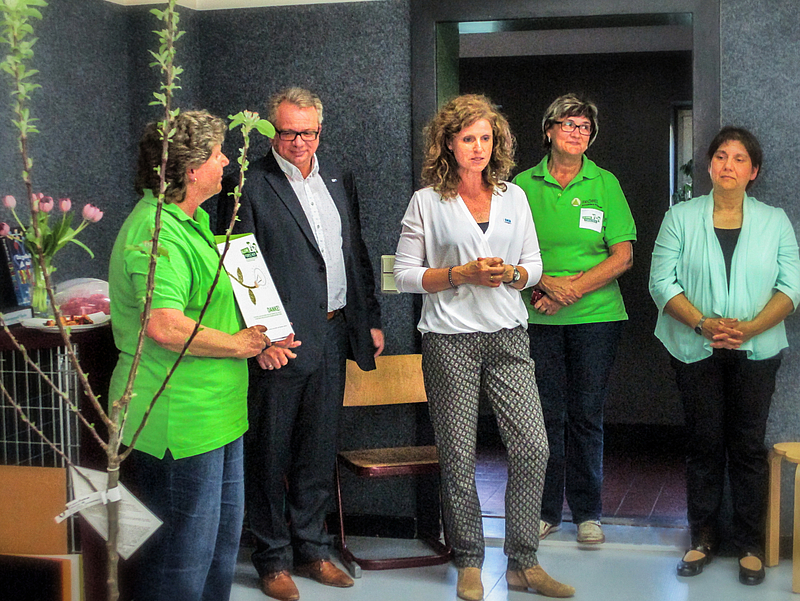 Michael Götz ist Fachberater Ausbildung und Karriere im Bereich Schule/ Wirtschaft und arbeitet mit dem HdkF zusammen. Er wird beauftragt die Zertifizierungen der Stiftung Haus der kleinen Forscher durchzuführen. Er bedankte sich bei den Forscherkindern und dem engagierten Team für ihren Enthuasiasmus und ihre kreativen Forscherideen. Er motivierte die Kinder, niemals die Neugier zu verlieren und immer alle Fragen zu fragen: „Erst durch das aktive Forschen tauchen immer weitere Fragen auf. Ab diesem Zeitpunkt wird experimentiert!“. Er wünschte den Kindern und dem Team weiterhin viel Erfolg und überreichte als Anerkennung und Gastgeschenk einen Apfelbaum.