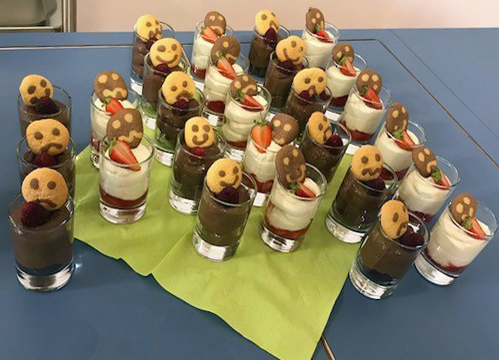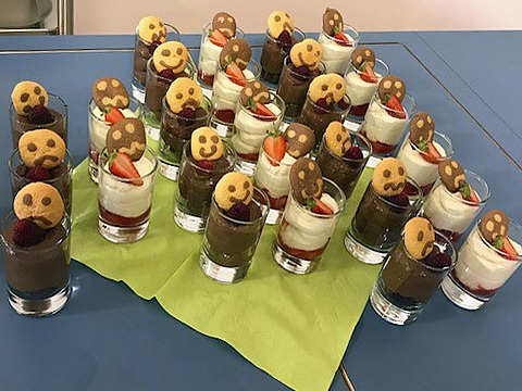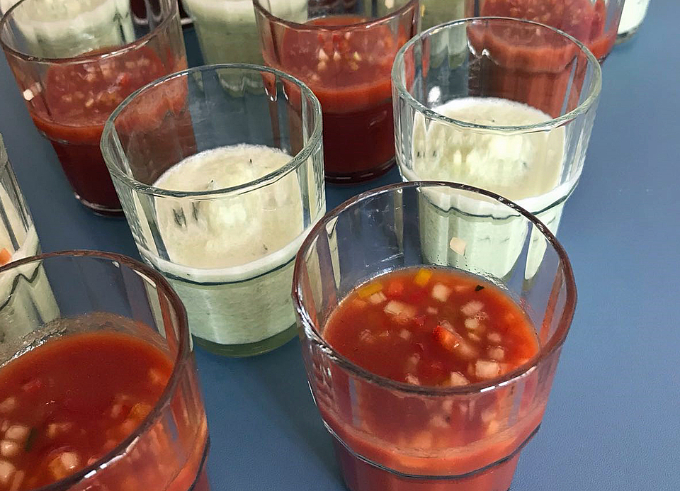 Für besondere kulinarische Köstlichkeiten mit Zutaten sorgte an diesem Abend Oliver Zörb. Er ist Koch aus Leidenschaft im Münchner FRÖBEL-Haus für Kinder Mainzer Straße und kreierte ein Menü mit Zutaten aus regionalem Anbau. Es gab geeistes Gurkensüppchen mit Minze und Gazpacho, marinierte Forelle auf Mangold-Kartoffelstampf, Gemüsenudeln mit Zucchini-Haselnuss-Pesto und Grünkernrisotto mit Grillgemüse und Halloumi.