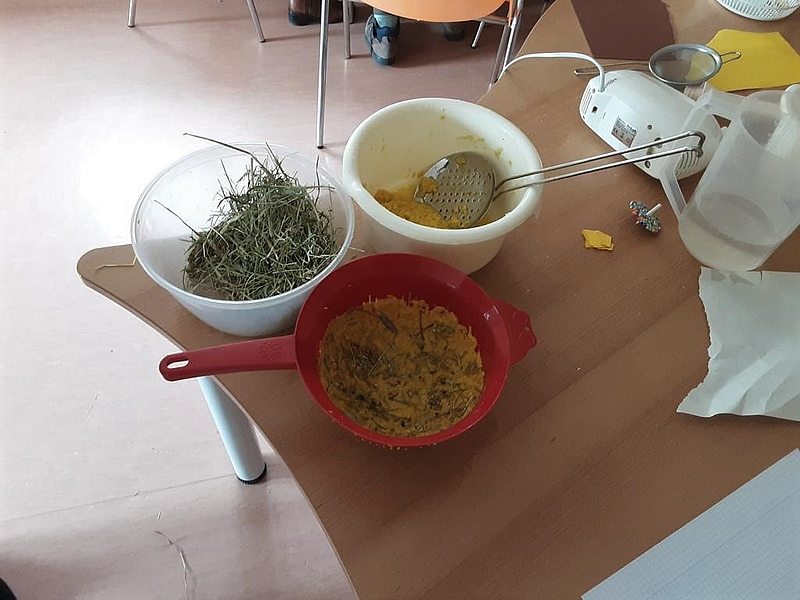 Das Produkt Papier begleitete uns auch in der 2.Ferienwoche. So haben die Kinder Papierschiffe gebaut und Papier geschöpft.