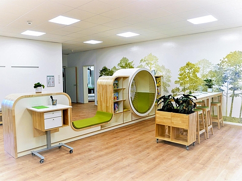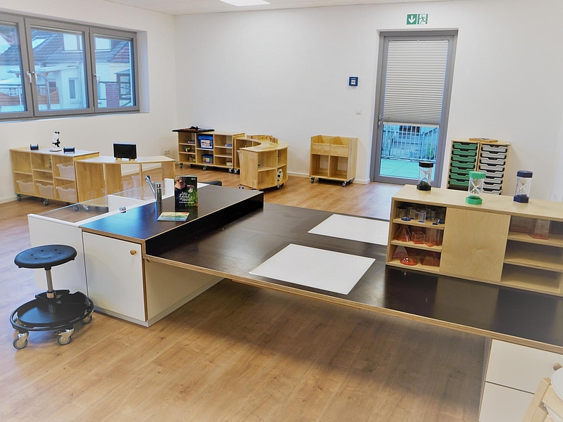 Das großzügig geschnittene Haus bietet viel Freiraum für die Kinder. Neben einem komplett eingerichteten Forscherlabor gibt es ein Atelier, einen Bewegungsraum mit Kletterwand, eine Bibliotheksecke sowie eine Elternlounge.