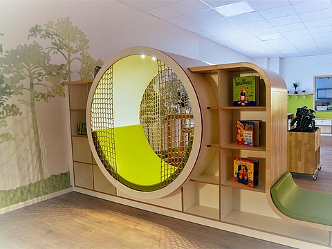 Leiter Marcel Retat wünscht sich eine Kommunikation mit den Kindern auf Augenhöhe. Darauf wurde nicht nur bei der Planung der Inneneinrichtung Rücksicht genommen - alles wurde in kindgerechter Höhe gefertigt, auch für das Lesen von Aushängen oder für das Anschauen von Bildern, müssen sich Erwachsene auf die Höhe der Kinder begeben.