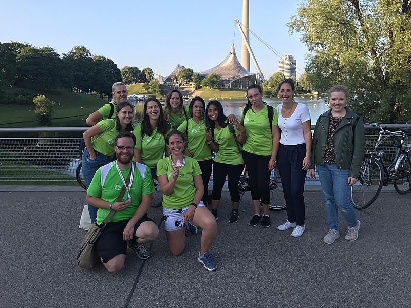 Sie wurden unterstützt von weiteren Mitarbeiterinnen und Mitarbeitern, die das Team mit Motivationsrufen von der Fanmeile aus anspornten. Den Abend beschlossen wir auf dem Sommer Tollwood Festival im Olympiapark.