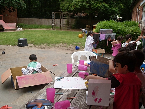 Der Waschraum war zu Beginn der „liebste Raum“. Hände waschen, Haare stylen, Wasser von einem Gefäß ins andere schütten, sich im Spiegel betrachten etc. waren - und sind heute noch - wichtige Beschäftigungen. Zum Glück haben wir genügend trockene Wechselkleidung für die Kinder nun da.