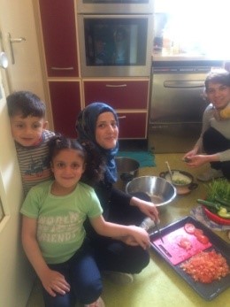 Auch an das Essen mussten die Kinder sich gewöhnen: Am Anfang waren ihnen unsere Mahlzeiten fremd und sie aßen nur vorsichtig, was angeboten wurde. Dank der Familien, die sich bei uns in der Küche engagieren und den Kindern bekannte Gerichte kochen, wird gut gegessen. Besonders beliebt sind Reis- und Bulgurgerichte mit Salat und viel Blattpetersilie.