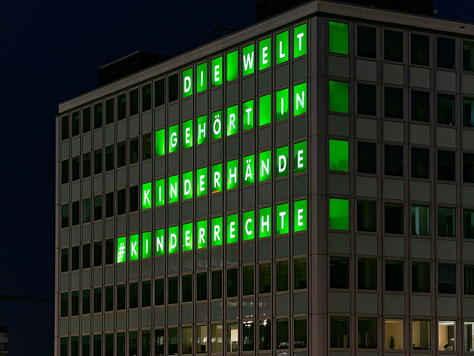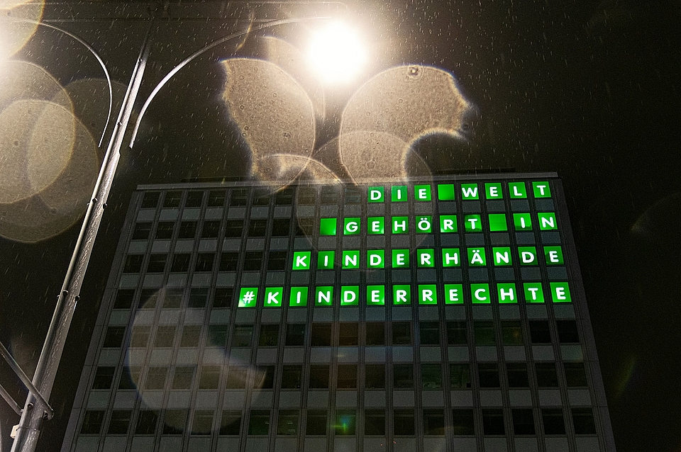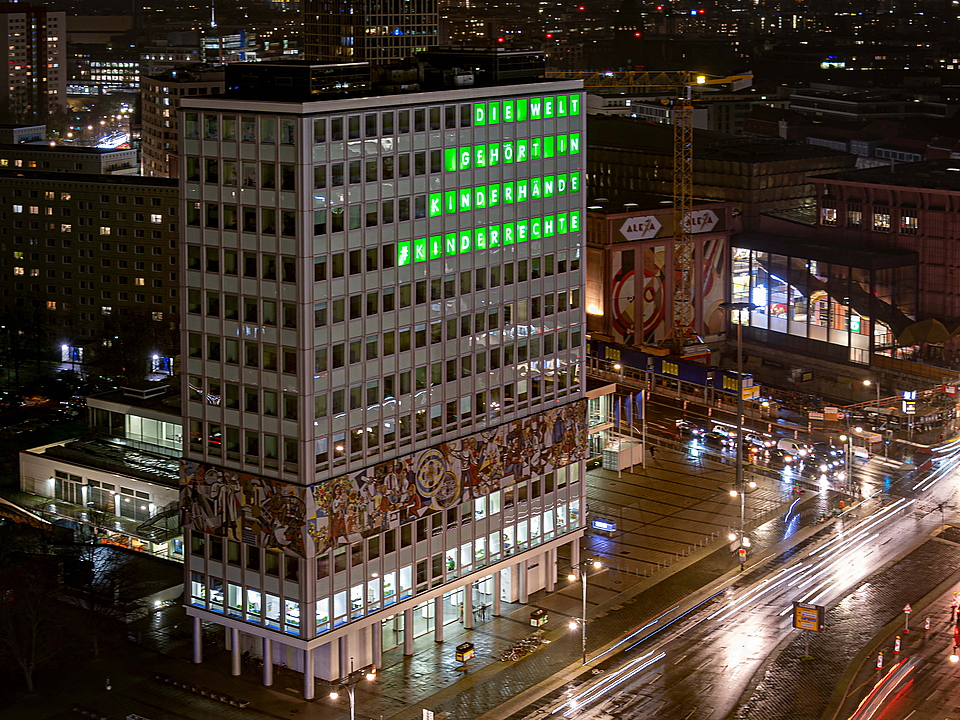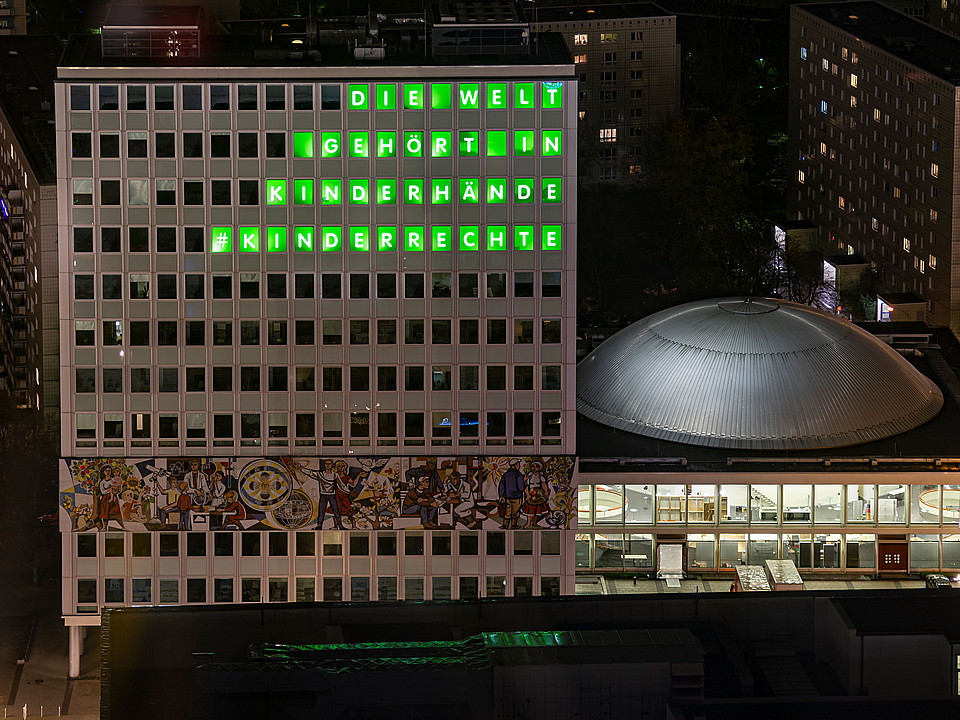 Zum Internationalen Tag der Kinderrechte lässt FRÖBEL die Fenster des Hauptsitzes im Haus des Lehrers am Berliner Alexanderplatz erstrahlen. Zu lesen ist: "Die Welt gehört in Kinderhände!", Hashtag #Kinderrechte.