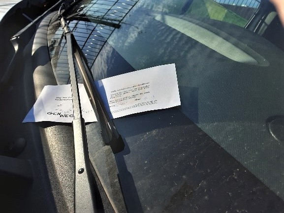 Auf den Knöllchen steht: „Liebe Autofahrerin, lieber Autofahrer, ich wünsche mir, dass ich sicher über die Straße gehen kann und eine freie Sicht zur KiTa habe. Bitte parke richtig, damit Du mich nicht gefährdest.“ Danke!