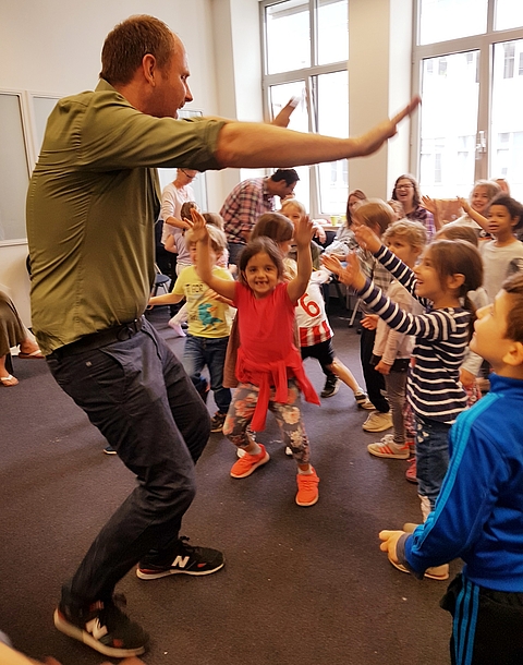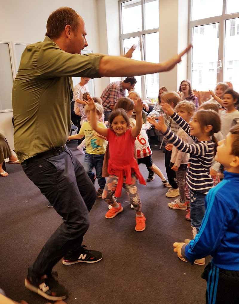 Insgesamt 37 Mädchen und Jungen folgten am 12. Juni 2018 begleitet von 15 Eltern, Erzieher*innen und einer Großmutter der Einladung des Geschäftsleiters Arnd Kortwig zur großen Dankes-Vernissage in die FRÖBEL Geschäftsstelle in NRW und verbrachten einen aufregenden, spannenden, Spaß geladenen Vormittag miteinander. Empfangen wurden die Kinder mit Brause und einem großen Buffet herrlichster Köstlichkeiten, ehe es gemeinsam auf Löwenjagd ging – einem Bewegungsspiel zum Mitmachen für Kinder aller Altersklassen. Unter tosendem Beifall und staunenden Rufen der Künstlerinnen und Künstler fand im Anschluss die große Enthüllung der „Kunst für Kortwig“ statt.