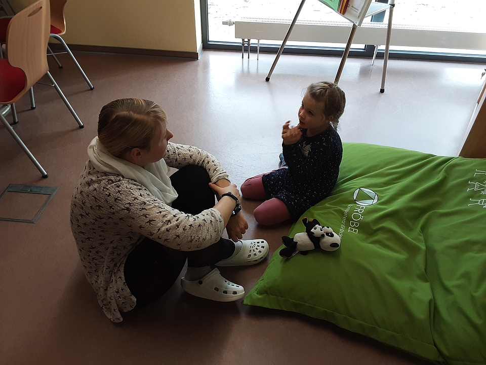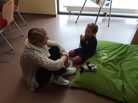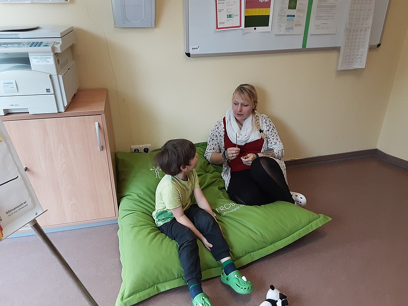 Bereits im Flur, welcher liebevoll mit Sitzkissen und einer Bücher- und Bausteinkiste ausgestattet wurde, warteten die Kinder gespannt darauf, der oder die Nächste sein zu dürfen. Nacheinander wurden alle Teilnehmer*innen in den Besprechungsraum gebeten, um am Tisch oder entspannt auf einem Sitzkissen von ihren Problemen, Sorgen, Ängsten oder positiven Erlebnissen berichten zu können.
