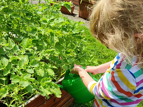 Im Frühjahr bauten Kinder des FRÖBEL-Kindergartens am Alfried Krupp Krankenhaus zusammen mit den Fachkräften fünf Hochbeete aus alten Holzregalen für den Garten. Seitdem wachsen dort verschiedene Gemüsesorten. Von der Idee über das Bauen bis hin zu Saat, Pflege und Ernte lag alles in Kinderhand.