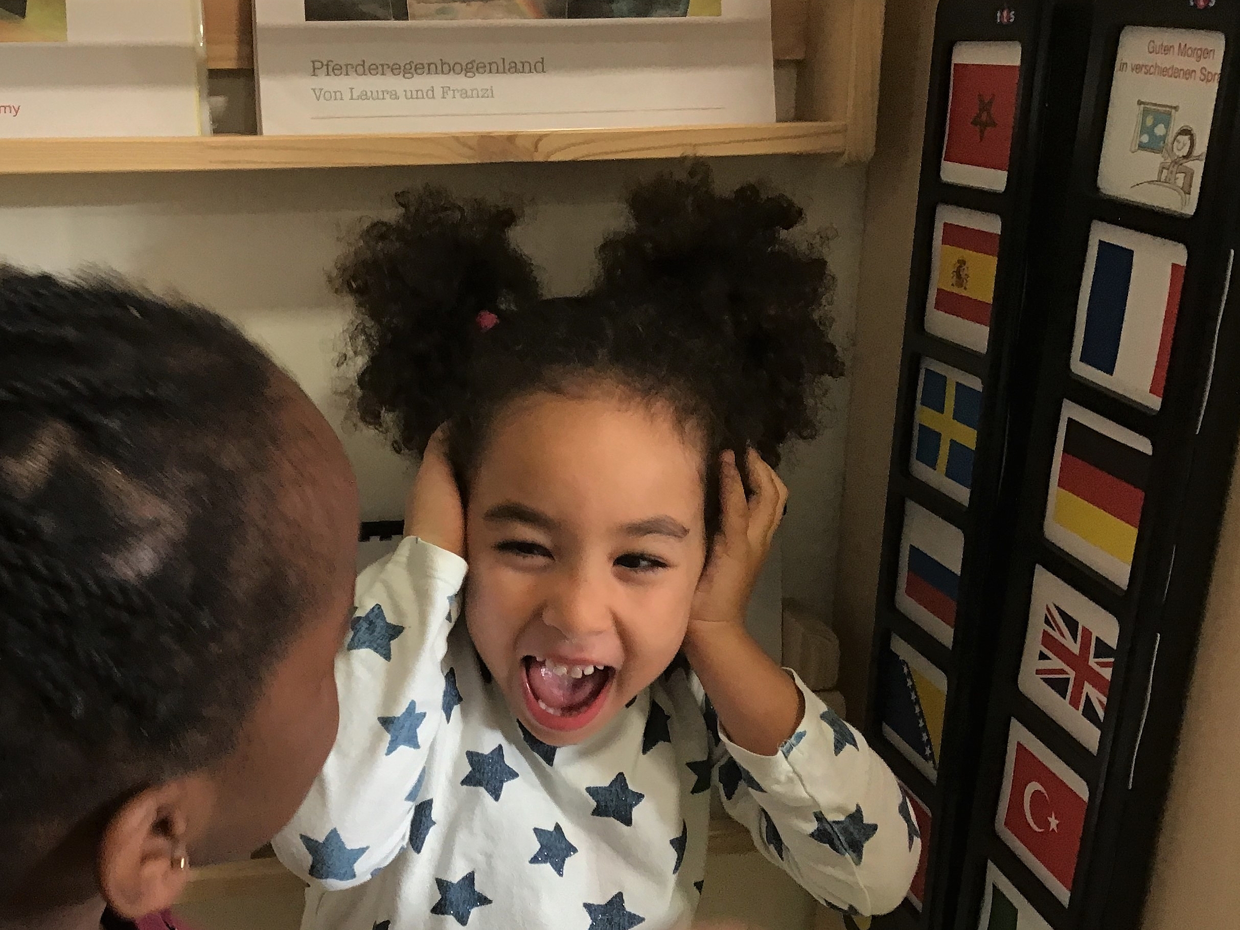 So entstand die Idee, den umfangreichen Sprachschatz der Einrichtung dauerhaft zu stärken. Dabei unterstützen nun zwei Erzählboards. Auf den Boards kann ein bestimmtes Wort in insgesamt 12 verschiedenen Sprachen gespeichert werden. Aktuell haben die Kinder "Guten Morgen" auf die mit Flaggen hinterlegten Felder der Boards aufgesprochen. Die Kinder hatten sehr viel Spaß dabei, die Felder mit ihrer eigenen Stimme zu besprechen. Viel spannender als das Aufnehmen ist allerdings das Anhören! Die Kinder drücken auf eine der Flaggen und lauschen der fremden Sprachmelodie.