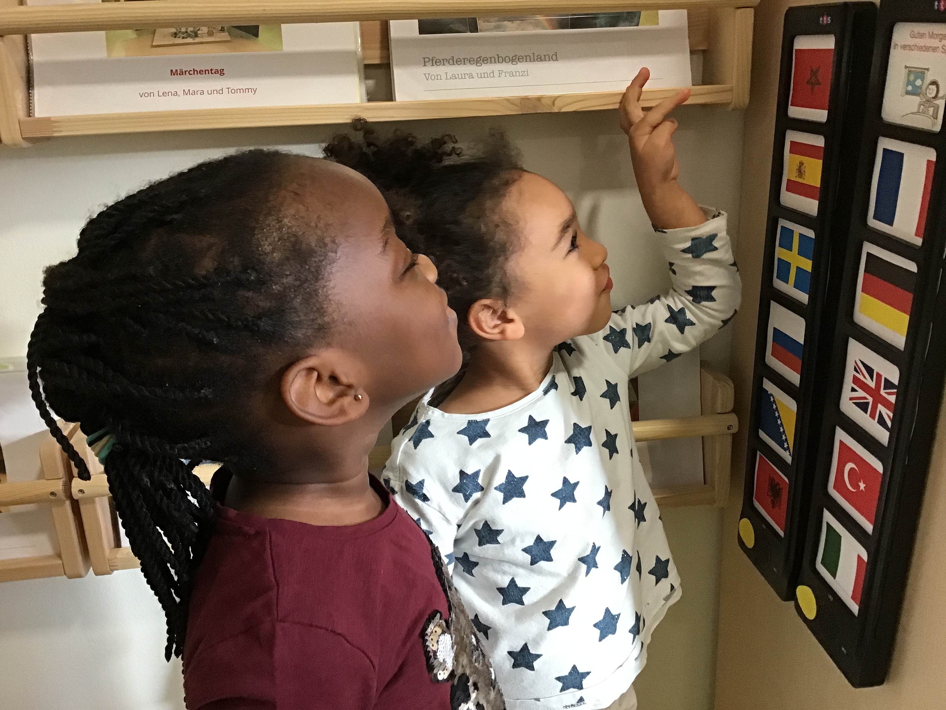 Im FRÖBEL-Haus für Kinder Eisnergutbogen in München unterstützen zwei Erzählboards die Kinder beim Erkunden und Lernen von insgesamt 12 verschiedenen Sprachen.