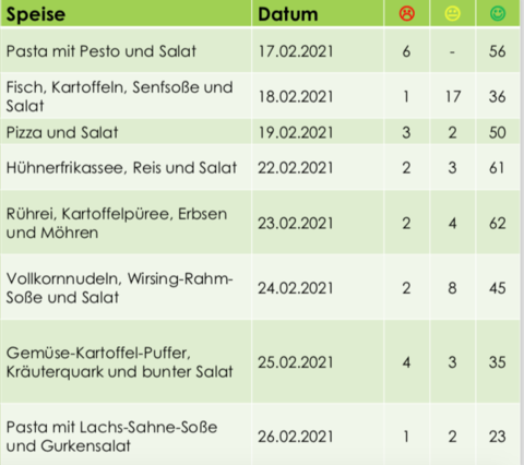Jeden Tag haben die Kinder nun die Möglichkeit das frisch gekochte Mittagessen zu bewerten. Im Anschluss daran wertet Köchin Natascha die Ergebnisse mit den Kindern gemeinsam aus und es werden Schlüsse für die Gestaltung des Essensplan daraus abgeleitet.