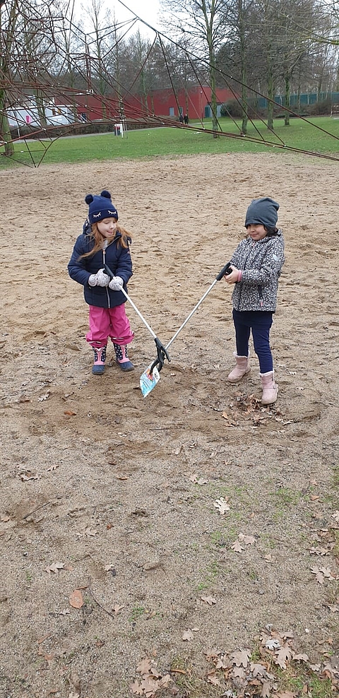 Außerdem haben die Kinder zwei Sandspielzeuge gefunden. Eins war schon halb vergraben und zugewachsen. Die haben sie wieder in den Sandkasten geworfen.