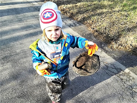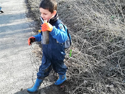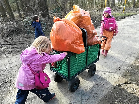 Nachdem Rheinhochwasser sind die naheliegenden Wiesen und Wälder voller Müll. Die Kinder ärgert das sehr. Sie möchten eine gesunde und saubere Natur. Deswegen ziehen wir – ganz im Sinne des aktuellen FRÖBEL-Mottos „die Welt gehört in Kinderhände“ – los und befreien die umliegende Landschaft von Müll.