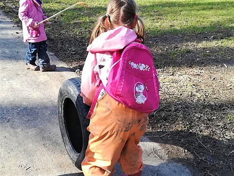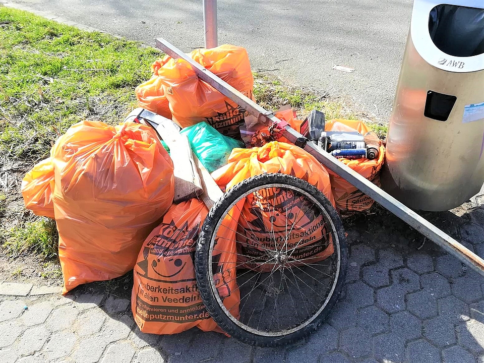 Während der Müllsammelaktion kam so einiges zusammen: eine Spielzeugtrompete, Lampen, Ölkanister, Zigarettenstummel, Spraydosen, Glas- und Plastikflaschen, Autoreifen, Schuhe und jede Menge Styroporteile. Nach ca. 2 Stunden war der Bollerwagen randvoll und die Kinder erschöpft. Zeit zurück in die Kita zu gehen.