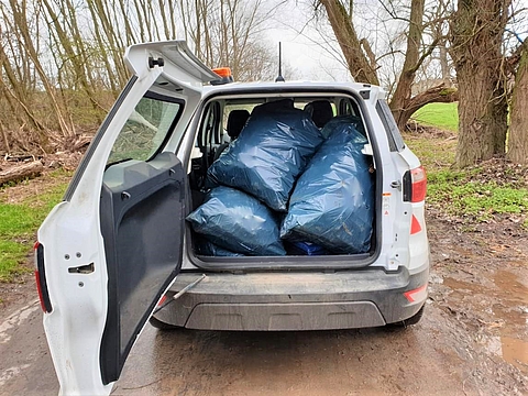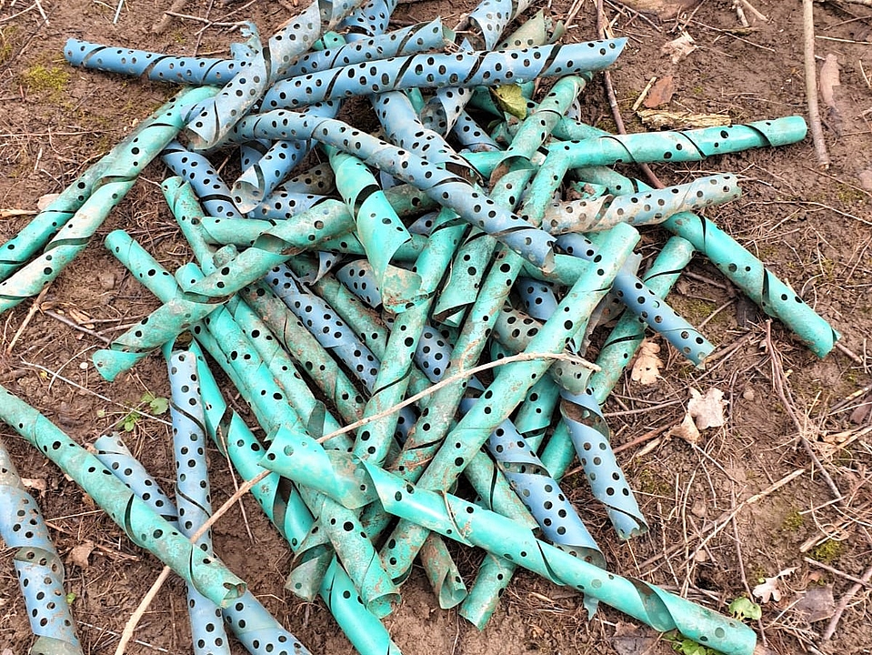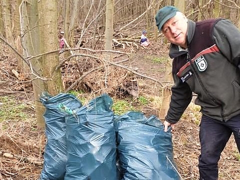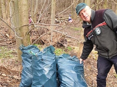Wir wollen helfen! Gemeinsam mit dem Förster sind die Kinder in den Wald gegangen und haben sich auf die Suche nach überflüssigen und alten Baumschutz gemacht. Am Ende der Tour waren 5 Müllsäcke gefüllt und im Auto des Försters kein Platz mehr.