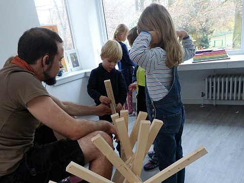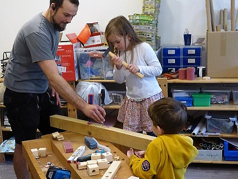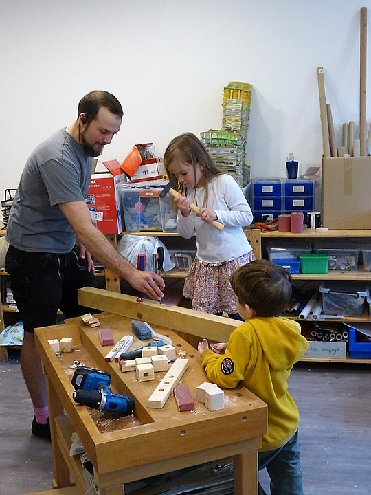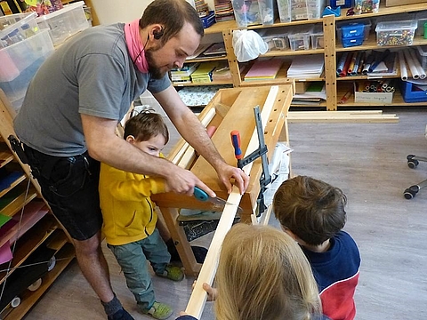 An die Werkzeuge, fertig, los: Die Kinder im FRÖBEL-Kindergarten Am Alfried Krupp Krankenhaus haben einen Tannenbaum aus Holz gebaut.