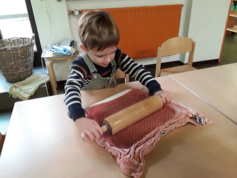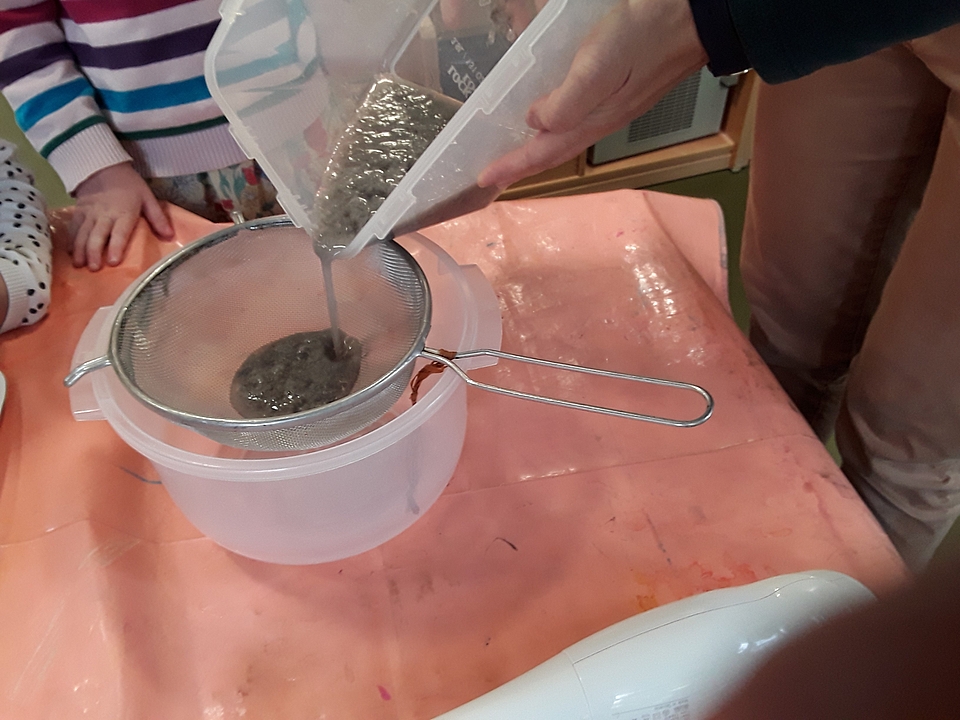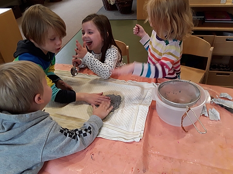 In einem Buch haben wir die passende Anleitung gefunden und so haben zwei Erzieher*innen mit den dazugehörigen Kindergruppen aus alten Zeitungen neues Papier hergestellt. Im ersten Schritt hat jedes Kind ein Zeitungsbogen zerrissen und die Schnipsel in einer Schüssel mit Wasser übergossen. Aufregend wurde der nächste Schritt, da wir mit einem Stabmixer die Schnipsel püriert haben. Jeder durfte sich versuchen und der Papierbrei sah wirklich eigenartig aus. Der Papierbrei wurde durch ein Sieb ausgepresst und dann auf einem Küchentuch verteilt und mit einem Nudelholz festgedrückt. Nun musste die Masse über Nacht, mit Hilfe der Heizung, trocknen und konnte am nächsten Tag von uns begutachtet werden.