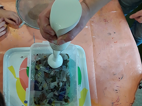 Bei uns im Kindergarten malen und basteln unsere Kinder sehr gerne mit Papier. Da wir in unserem Kindergartenalltag der Nachhaltigkeit viel Raum geben wollen, wählen wir auch immer wieder Beispiele, die den Kindern diesen Ansatz nahebringen. So bietet sich beim Malen durchaus an, dass die Kinder Vorder- und Rückseite nutzen und somit achtsam mit den Resourcen umgehen. Aus diesem Punkt hat sich die Idee entwickelt, dass das Papier auch von uns hergestellt werden kann.