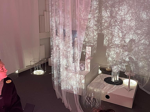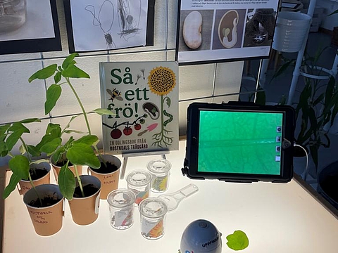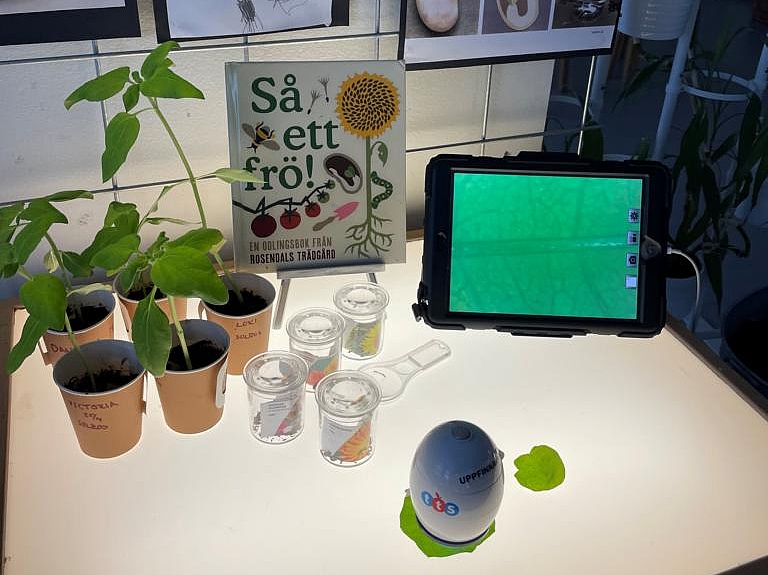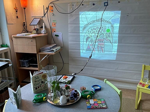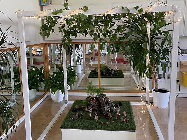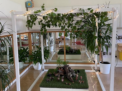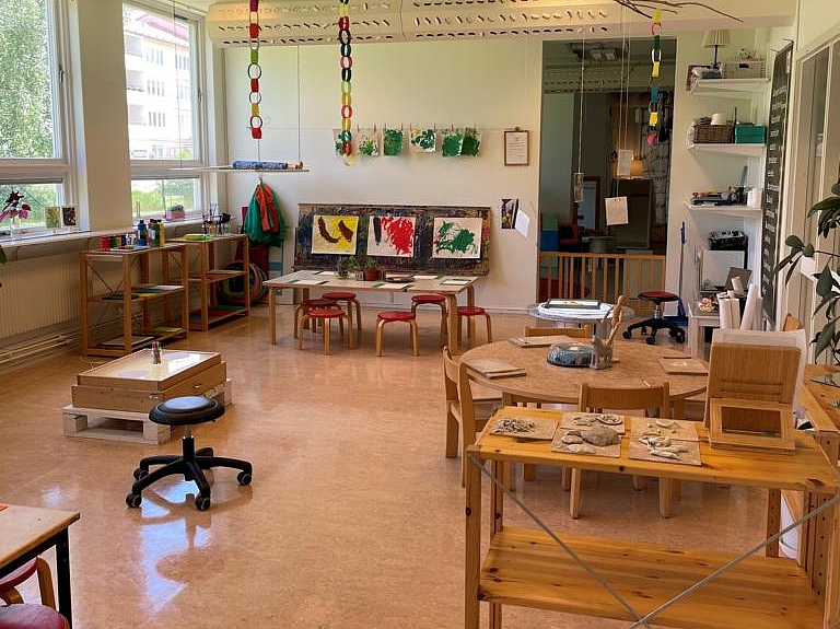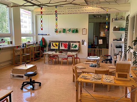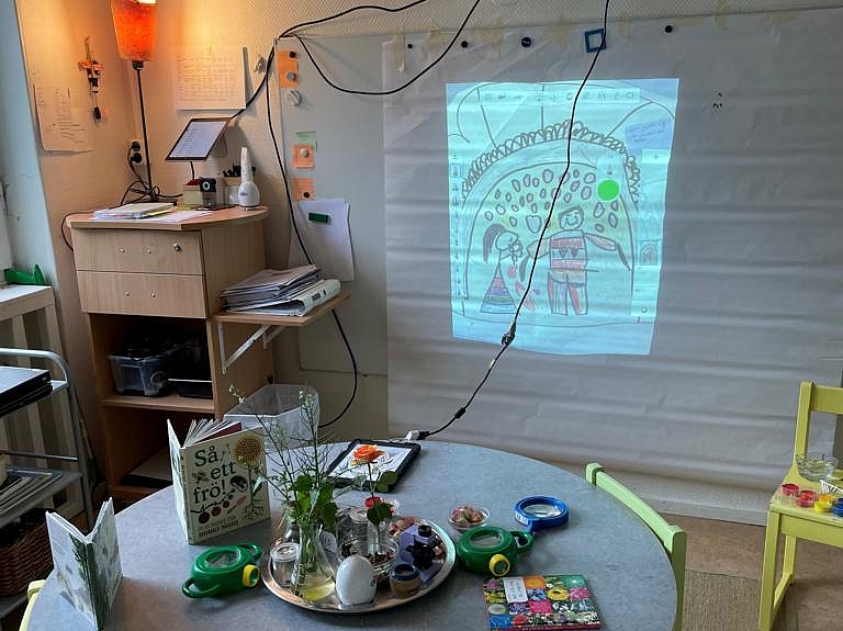 Begeistert machte sich das Team mit dem Bus auf den Weg in die nächste Einrichtung. Angekommen in der Vorschule „Pumpan“ staunten die Kolleginnen und Kollegen aus München nicht schlecht über die Innenarchitektur der Einrichtung. Das Thema Natur wird hier stark in den Alltag eingebaut. Das liegt zum einen am Standort, denn die Einrichtung grenzt direkt an ein Waldgebiet. Zum anderen besitzt die Einrichtung einen großen Garten. Auf Fensterbrettern stehen verschiedenste Pflanzen. Phiolen mit kleinen Setzlingen hängen von der Decke und jeder Bildungsbereiche motiviert, die Natur aus anderen Blickwinkeln zu betrachten. Im Atelier malen die Kinder verschiedene Blätter oder Pflanzen mit bestimmten Stiften nach. Im Nestbereich ist es möglich, eigene Samen in kleine Töpfchen zu pflanzen. Im Licht und Schatten Raum wird mit Leuchttischen und Projektoren gearbeitet. So krabbeln große projizierte Ameisen an Wänden und Türen und Pflanzen werfen ihre Schatten durch den Raum.