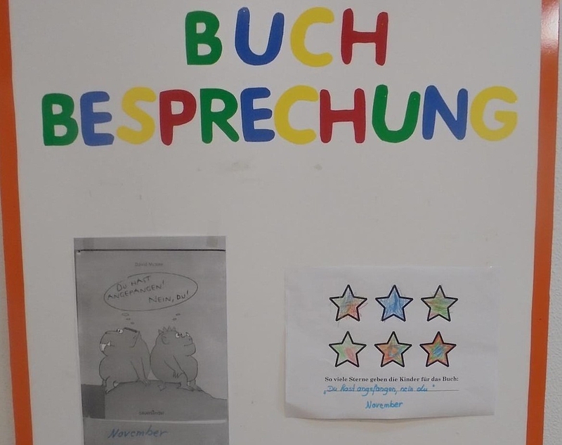 Um im Alltag immer wieder Sprachanlässe und das Lesen von Geschichten zu fördern, haben wir gemeinsam mit den Kindern das „Buch des Monats“ eingeführt. Jeden Monat wird ein Buch gekürt. Dafür besprechen wir gemeinsam mit den Kindern regelmäßig die Bücher, sie geben Feedback und verteilen Sterne für die Bücher, die sie besonders gut finden.