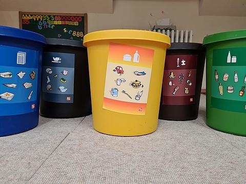 Die Pädagog*innen haben den Themenkreis so gestaltet, dass er an einen Ozean erinnert. In ihrem Ozean haben die Kinder Müll vorgefunden, den die Pädagog*innen vorher verteilt hatten. Sie stellten sich die Frage, was mit ihrem Müll passiert. Herausgefunden haben sie dabei, dass es vor allem auf die Mülltrennung ankommt, da verschiedene Müllsorten unterschiedlich verarbeitet werden. Den Müll in ihrem Themenkreis haben die Kinder deshalb aufgesammelt und in verschiedene Mülleimer einsortiert.