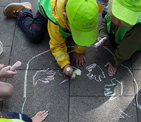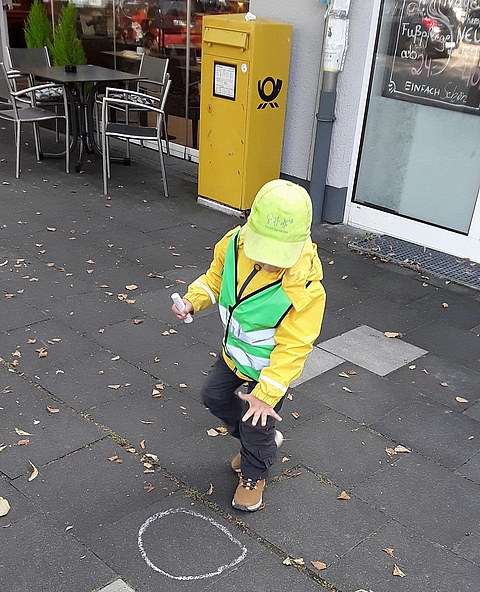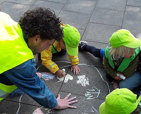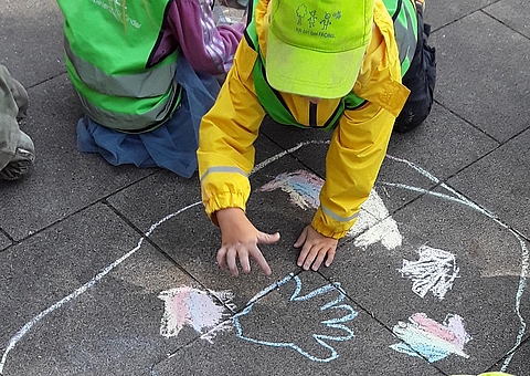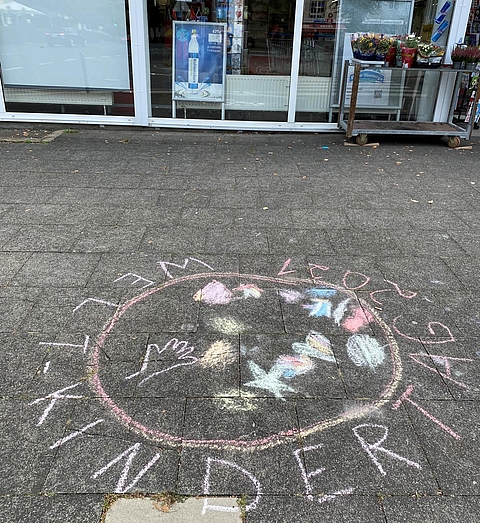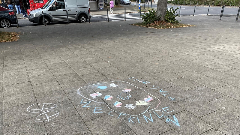 Die Kinder des FRÖBEL-Kindergartens WOLKE 7 malten mit Straßenmalkreide einen Globus und ihre Hände, versehen mit dem Schriftzug "Weltkindertag 2021" auf die Bürgersteige der Umgebung und machten so das Jahresmotto und den heutigen Weltkindertag für alle sichtbar.