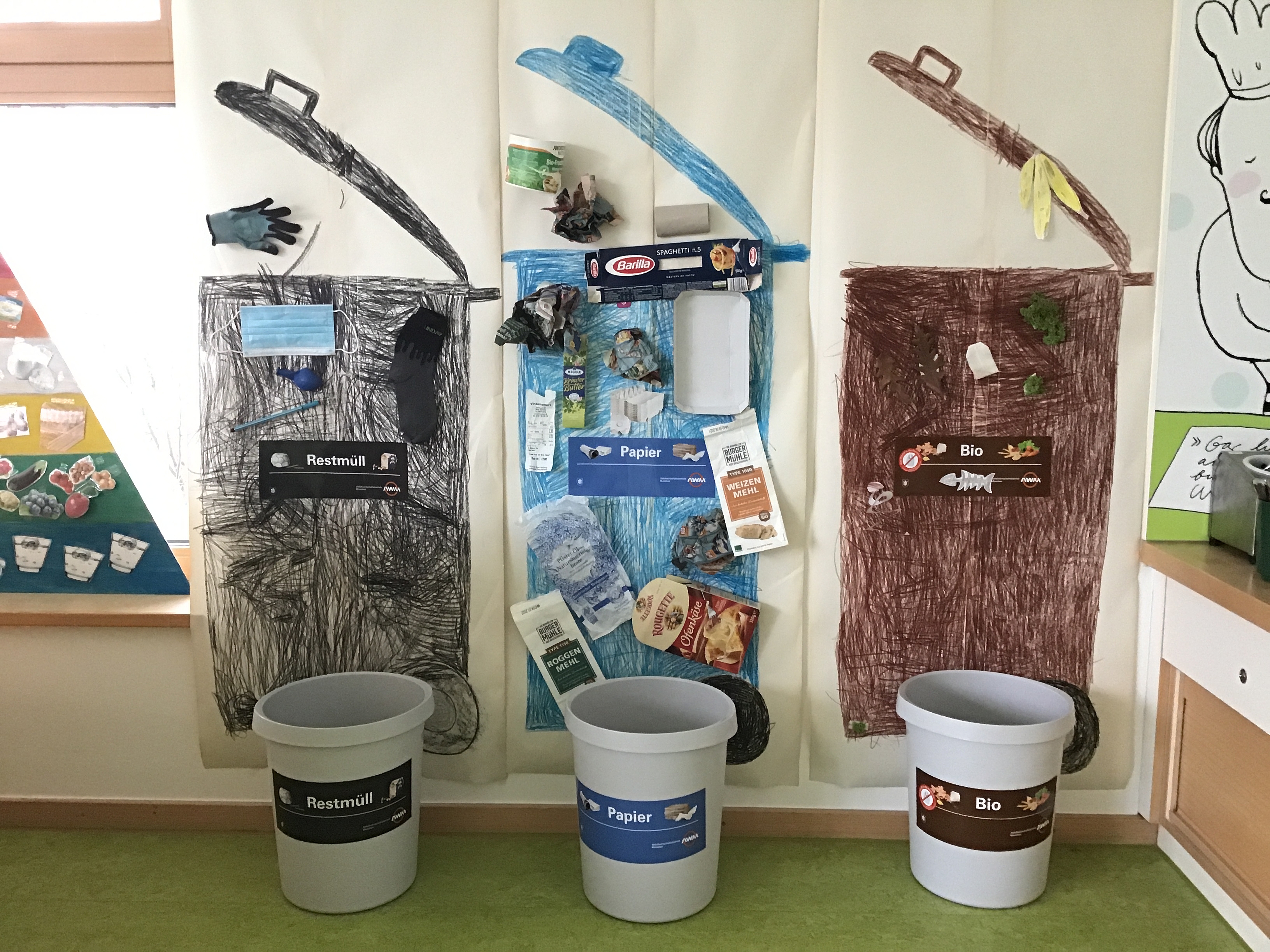 Zum Auftakt des Projekts unternahm das Team mit den Kindern einen Spaziergang durch den nahegelegenen Hirschgarten und schauten bewusst darauf, wieviel Müll wir dort vorfinden. Die Kinder haben überlegt, ob beim Einkauf von Äpfeln wirklich immer Pappe und Plastik anfallen müssen, fanden heraus, dass es viele Produkte auch in Mehrwegverpackungen gibt und haben Baumwollbeutel bemalt, um zukünftig Plastiktüten zu ersetzen. Aktuell werden die Kinder zu wahren Müll-Trenn-Meistern, die ihren Abfall zielgerichtet in der richtigen Mülltonne entsorgen und denen auch die Wertstoffinsel ein Begriff ist.