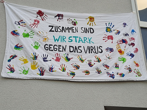 "Zusammen sind wir stark gegen das Virus": Die Kinder des FRÖBEL-Kindergartens Quellenpark aus Kerpen möchten allen Betroffenen mit dieser Botschaft etwas Freude bereiten.