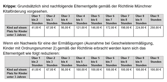 - Die Höhe der Elternbeiträge richtet sich nach den offiziellen Gebühren der Stadt München.